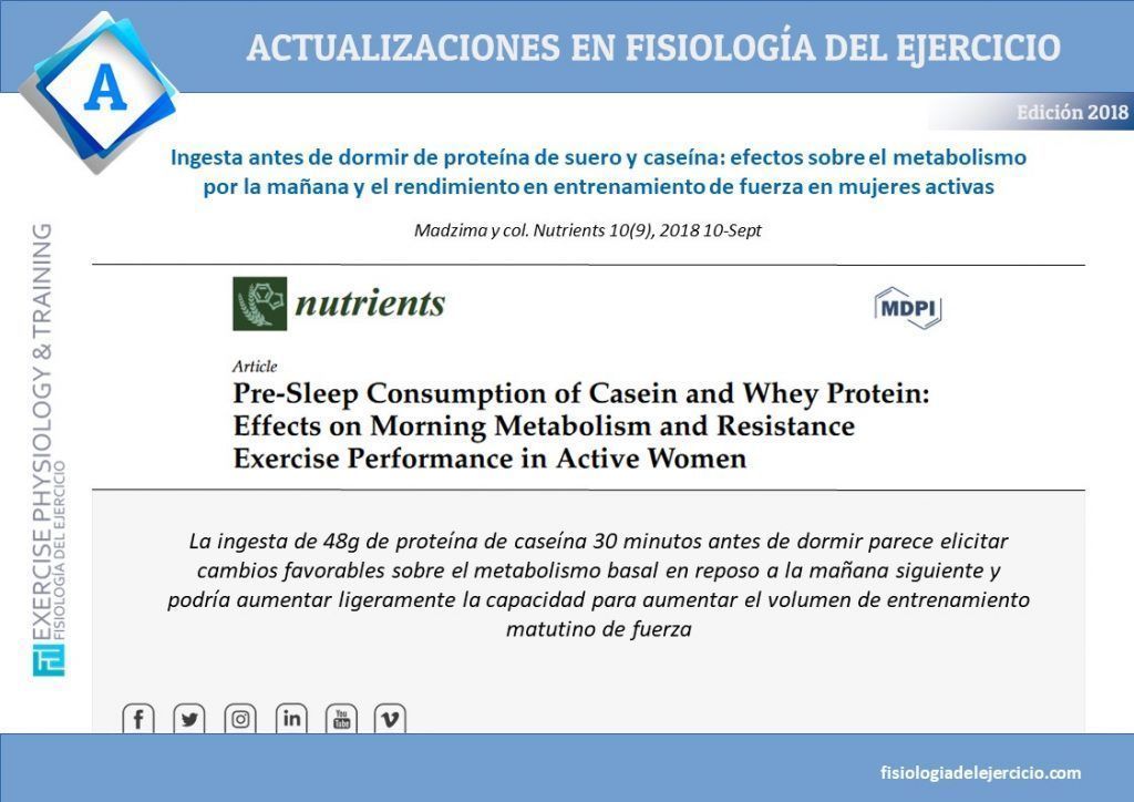 Ingesta antes de dormir de proteína de suero y caseína: efectos sobre el metabolismo por la mañana y el rendimiento en entrenamiento de fuerza en mujeres activas