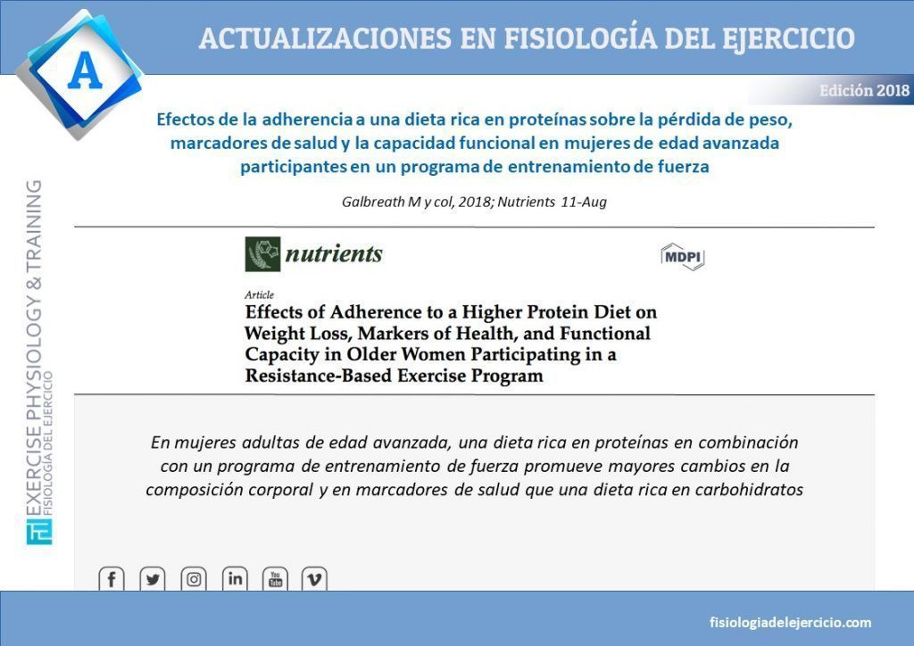 Efectos de la adherencia a una dieta rica en proteínas sobre la pérdida de peso, marcadores de salud y la capacidad funcional en mujeres de edad avanzada participantes en un programa de entrenamiento de fuerza