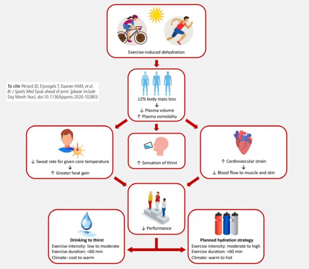 Durante el ejercicio realizado en ambiente caluroso y húmedo asegurar la euhidratación antes de la competición y minimizar la deshidratación