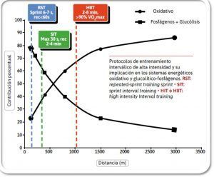El entrenamiento interválico de esprint es una modalidad de entrenamiento muy popular, que ha mostrado efectos positivos sobre el consumo de oxígeno máximo (VO2max), aunque no se conocen bien los mecanismos de esta adaptación. Recientemente se han publicado los resultados de un estudio (Gordon y col, 2020; J Sport Med Phys Fitness 60: 53-61; doi: 10.23736/S0022-4707.19.09912-2) cuyo objetivo fue determinar los efectos de un programa de entrenamiento interválico de esprint de alta intensidad (SIT) sobre el VO2max por medio de la cuantificación de las respuestas respiratorias y hemodinámicas. Participaron 36 sujetos que durante 4 semanas realizaron un entrenamiento SIT en bicicleta (8×20 s al 170% P-VO2max, con 10 s de recuperación) o un entrenamiento continuo (CET) (30 min al 70% P-VO2max), 3 sesiones/semana. Los resultados mostraron un aumento no significativo del VO2max del 4.1% con el SIT, y un 7% de aumento con el CET. No se observaron respuestas diferenciales entre ambas modalidades de entrenamiento en gasto cardiaco máximo y volumen sistólico máximo, mientras que la dif-max (A-V)O2 aumento de 15.8±4.8 a 18.3±2.9 mL/100 mL) (P=0.02) (ES=0.63) en SIT. Los autores concluyeron que una breve intervención con entrenamiento interválico de esprint se asoció con mejoras de la dif (A-V)O2 y utilización de sustratos anaeróbicos, más que en componentes relacionados con la respuesta hemodinámica.