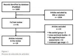 En la figura 1 se ilustra un diagrama de flujo del proceso de selección del estudio. La búsqueda obtuvo un total de 1095 artículos relevantes probables. Todos los artículos recuperados fueron revisados por dos revisores (OL y GZ). Las decisiones dudosas de inclusión/exclusión fueron resueltas por el coautor principal (YN). Después del cribado por título y/o resumen, 1054 artículos fueron excluidos debido a (i) irrelevancia del tema, (ii) siendo metaanálisis/artículos de revisión, (iii) resultados irrelevantes, (iv) la inclusión de uno o más grupos de pacientes, (v) ser un informe de un protocolo de estudio sin recopilación de datos, y (vi) ausencia de evaluaciones cognitivas o motoras al inicio y/o punto final. Los 41 artículos restantes se evaluaron como documentos potencialmente relevantes y se obtuvieron los documentos completos. Después de examinar los artículos completos, se excluyeron 22 artículos por las siguientes razones: intervalo de edad irrelevante, y diseño de pre y post prueba de un solo grupo. Los resultados de los 19 artículos mencionados anteriormente se resumieron con respecto a: (i) características demográficas de los participantes (tamaño total de la muestra, número de participantes del grupo y proporción de género), (ii) características de la intervención (protocolo de ejercicio, duración / frecuencia e intensidad del ejercicio), y (iii) los efectos de resultado de la intervención en funciones cognitivas y motoras específicas. Los resultados antes mencionados se presentan en la siguiente tabla.