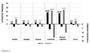 Como se puede ver en la figura 2, se informó tanto del mayor número de ganancias de rendimiento como de hallazgos negativos para el entrenamiento de ejercicio combinado y el entrenamiento cognitivo-motor. Sin embargo, las intervenciones mencionadas anteriormente también fueron las más frecuentes.