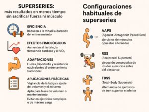 El entrenamiento en superserie constituye una estrategia eficiente y versátil dentro del entrenamiento de fuerza. Aunque las respuestas agudas incluyen mayor fatiga y estrés metabólico, los resultados crónicos demuestran adaptaciones equivalentes en fuerza, hipertrofia, potencia y resistencia respecto al entrenamiento tradicional, con un ahorro sustancial de tiempo.